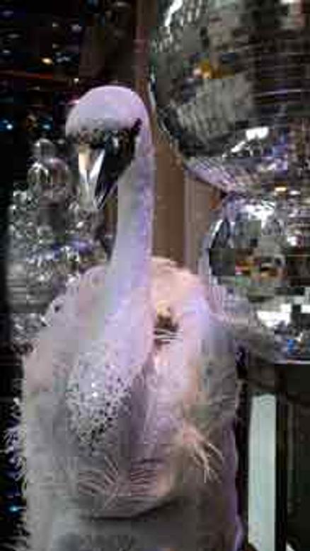 A large silver-sequined and white ostrich-feathered swan, designed and handmade by Rebecca Perrenod, is mounted in one of the central vitrines.