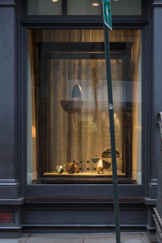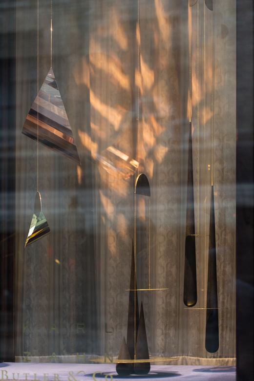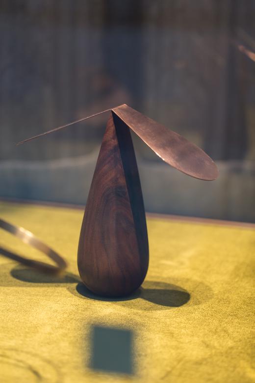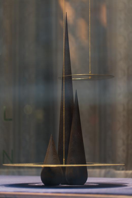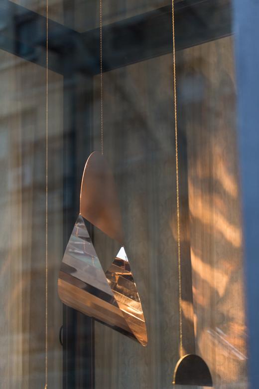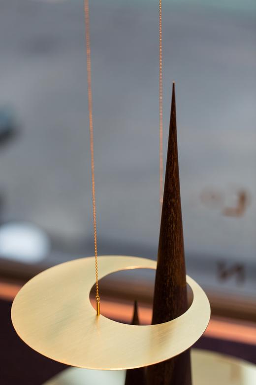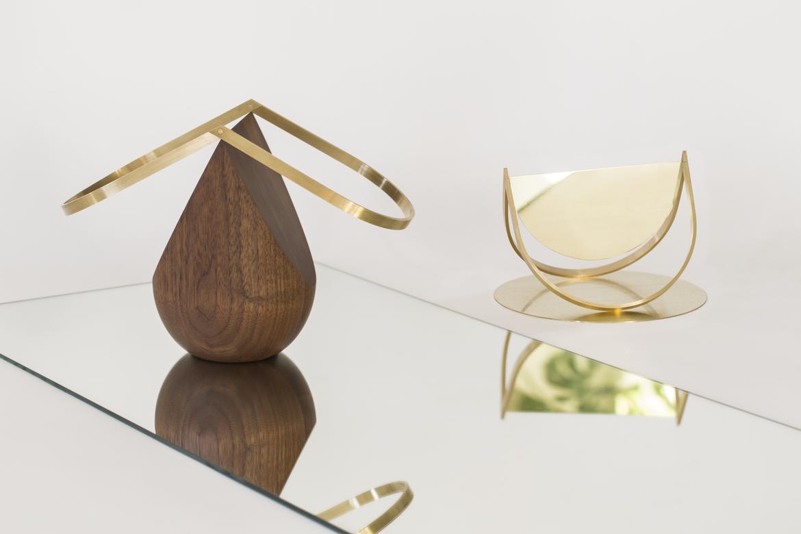 This new work holds a softer, gentler place. There is a smoothness and solidity to the pieces, a departure from the lithe and finicky artifacts from last year. Allowing lines to connect visually instead of literally with chain and metal, the viewer assumes a more integral role as a participant. Not only does the work require physical attention to set it in motion, but visual attention to translate and resolve optical effects and subtle slight of hand. There is a clear formal continuity connecting the show from last year, though this year finds the pieces edging back into functional territory. A place they weren't supposed to be.