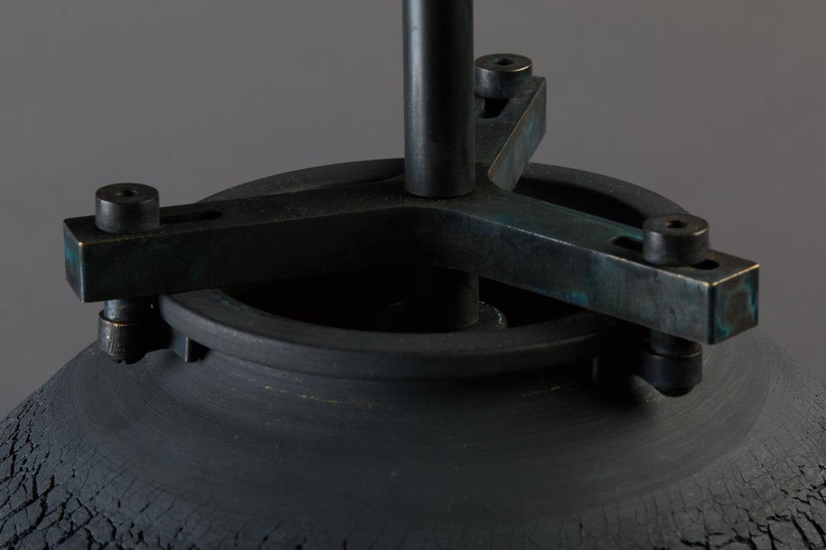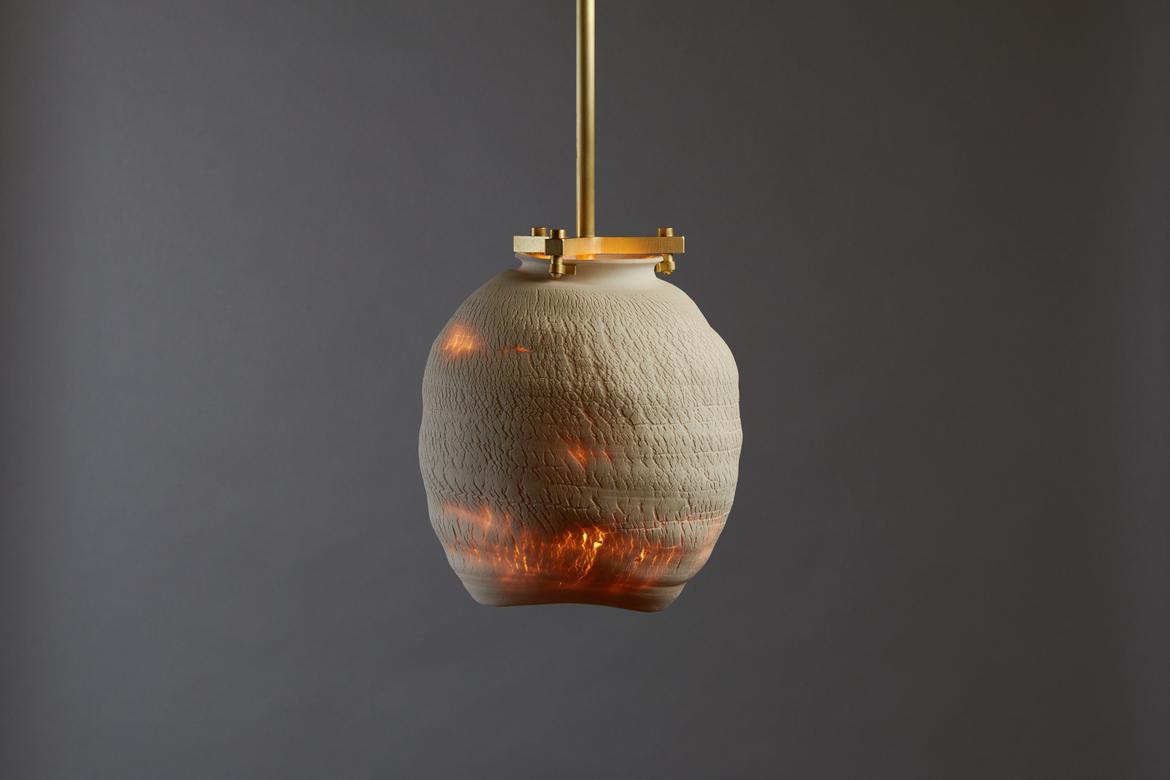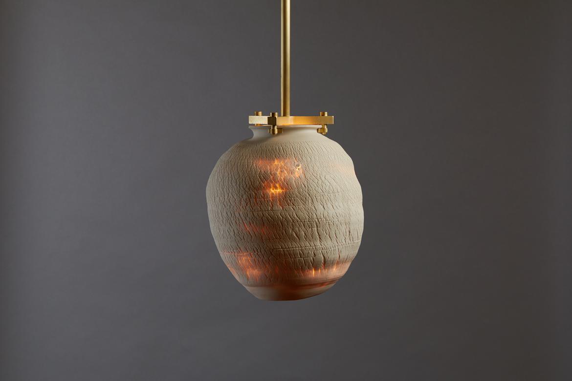 Each piece in the Desert Series is a unique work of art, made of porcelain using a unique fabrication technique developed with Paone’s paternal aunt, the ceramicist Anne Paone. Two new additions in this series, the Desert Table Lamp and Large Desert Pendant in the Negative Finish, offer the same visual and textural elements in an alluring shade of black with blackened brass hardware. The Negative Finish, conceived with new collaborator ceramicist Jeff Nimeh, takes the original series and inverts the aesthetic using metallic oxides and carbonates.