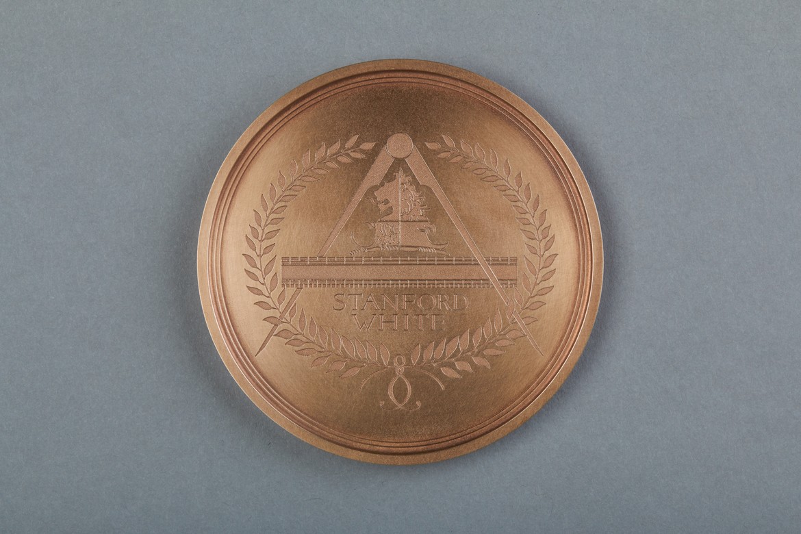 The design for the Stanford White Award Medallion is directly inspired by Stanford White’s own ex libris, designed by the early 20th century painter, etcher and woodcut artist, Allen Lewis, which illustrates White’s reputation for collaborating with other artists. A laurel wreath symbolizes achievement, the lion’s head strength, and the basic tools of an architects trade, dividers and a scale. The elements all “succinctly combined in this perfectly balanced work of art.”